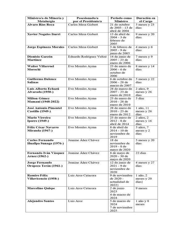 23. P. del Lic. Gonzalo Sánchez de Lozada (08/93 a 08/97). Se eliminó el Ministerio de Minería y Metalurgia y continuó así durante las presidencias de: Gral. Hugo Banzer (08/97 a 08/01), Ing. Jorge Quiroga (06/01 a 08/02) y Lic. Gonzalo Sánchez de Lozada (08/02 a 10/03).